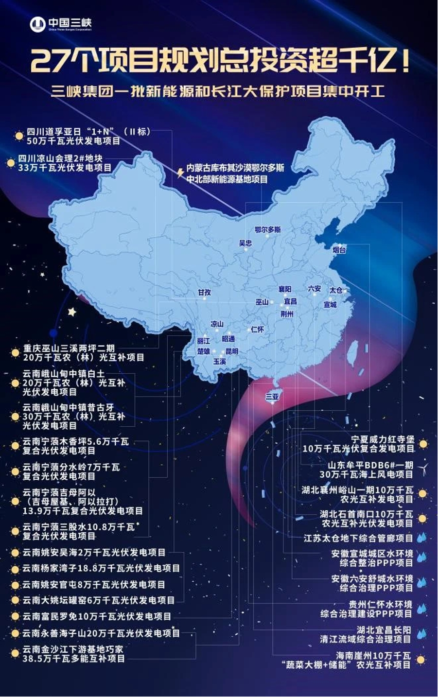 ? ? ? ?据了解,此次集中开工的27个项目规划总投资额达1090.55亿元,总装机规模1963.68万千瓦,涉及三峡集团6个二级单位投资主体,遍布全国11个省、市、自治区,全部为清洁能源和生态环保项目,符合国家推动经济社会发展绿色化、低碳化转型的方向,项目数量之多、投资总额之大、分布区域之广等创三峡集团历史纪录。