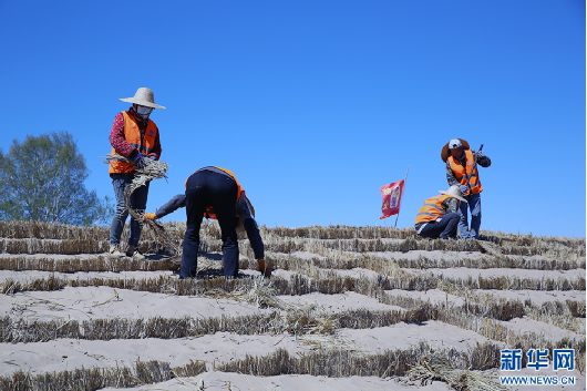 5月15日,工人在克什克腾旗境内的浑善达克沙地南缘铺设沙障。新华网石毅 摄