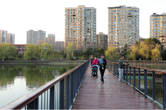 居民在园区内娱乐休闲,享受美景,怡然自得。 摄影:陈洁明