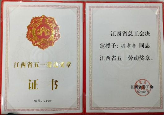 2025年5月16日,江西省总工会授予胡孝备“江西省五一劳动奖章”。