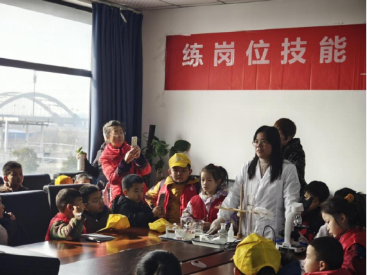 胡孝备在向九江小记者团展示污水趣味实验。刘邓玲 摄